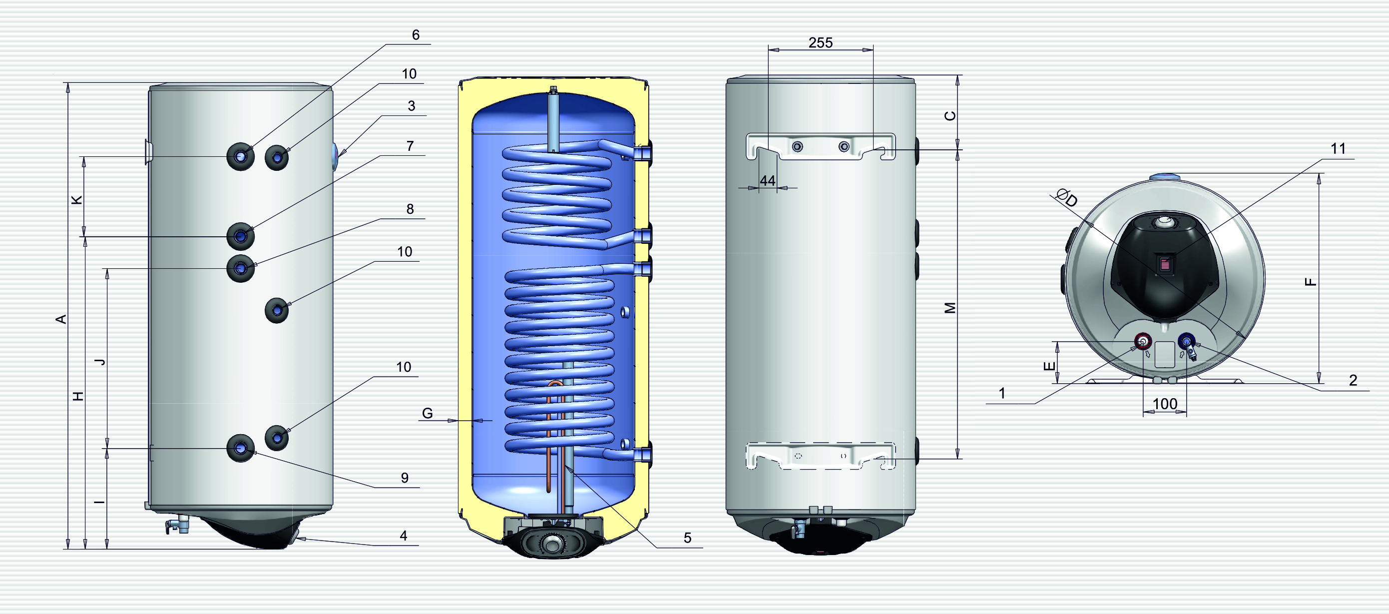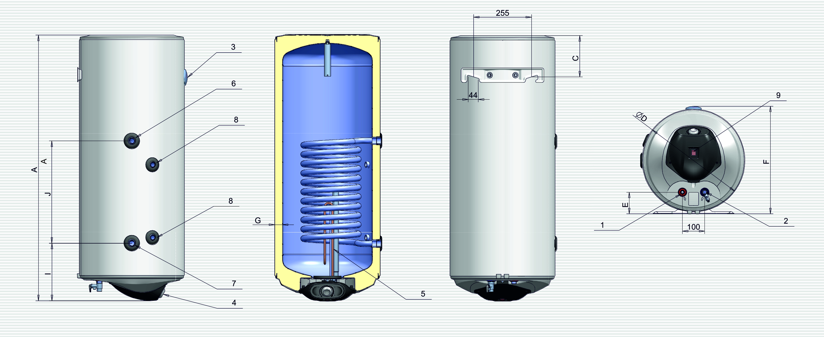 Наші 5 видів моделей обладнані теплообмінниками з широкою теплообмінною поверхнею. Він устанолюється в нижній секції пристрою і спроможний акумулювати максимум джерела тепла. Ці моделі призначені для під`єднання до системи, яка використовує сонячну енергію, але придатні для широкої теплообмінної поверхні: вони також підходять для універсального використання. Можуть використовуватись моделі з інтегрованим комбінованим електричним контролем різного об`єму.